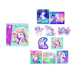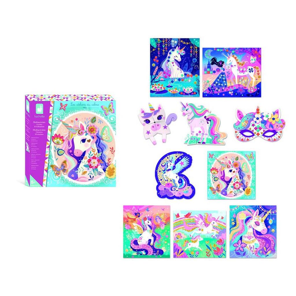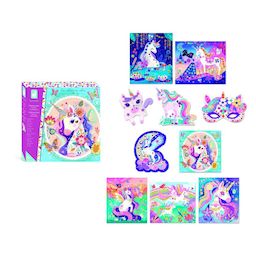 Ce kit propose une variété de projets et permet de réaliser : 1 masque décoré de mosaïques et d'autocollants pailletés, 2 images ornées de demi-perles et de mosaïques, 2 cartes à gratter, 1 portrait de licorne à décorer avec des éléments 3D, 1 cocotte en papier, 3 petites images à décorer avec des p