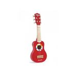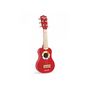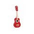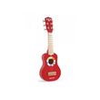 Guitare débutant en bois. Coloris rouge avec détail motif pois au centre de la caisse. design Français. Instrument de musique de type jouet. de 3 à 8 ans.