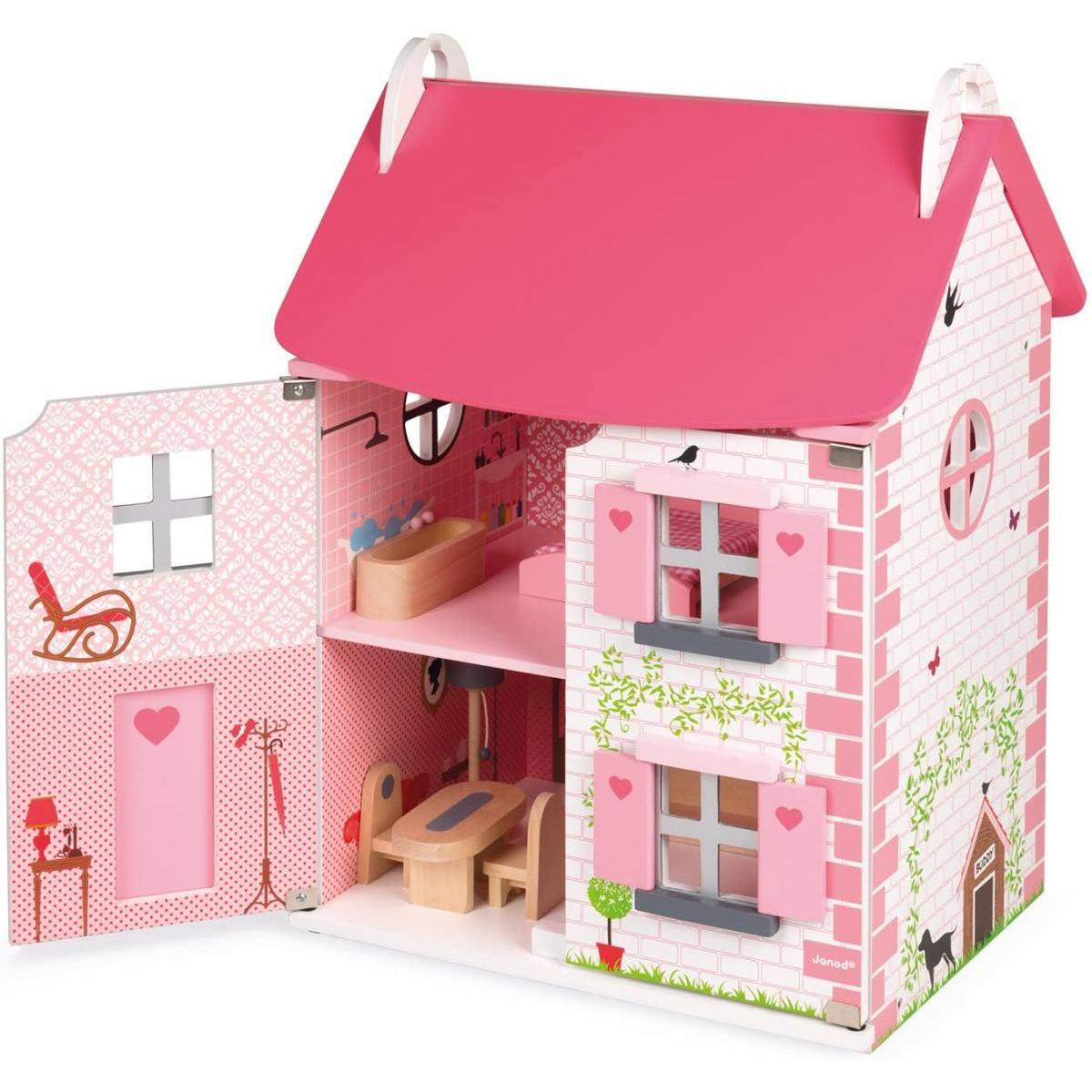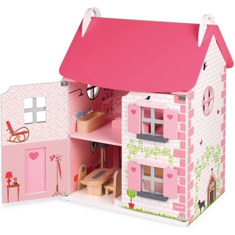 La maison de poupée en bois Mademoiselle est une maison en bois sur 3 étages décorée et meublée. Comprend 11 accessoires pour aménager sa maison: une armoire avec les portes qui s'ouvrent, un lit avec sa couverture, une coiffeuse, une baignoire, un canapé, une lampe, une table, 2 chaises et une cuisine.