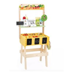 ? 58 accessoires inclus pour installer son propre marché fermier. ? Stimule l'imagination en faisant comme les grands. ? Les enfants jouent à la marchande dès l'âge de 3 ans : ils sont frais les légumes !. Le marché des petits producteurs est ouvert ! Notre marchande en bois Farm Market est le jouet idéal pour les enfants à partir de 3 ans qui adorent s'imaginer tenir leur propre commerce. Ce beau jouet d'imitation est équipé de nombreux accessoires pour une expérience de jeu enrichissante et réaliste. Au total, 58 accessoires complètent cette marchande pour enfant : d'abord, les fruits et légumes frais (3 carottes, 3 pommes de terre, 3 poireaux, 3 fraises, 3 pommes et 3 poires), puis les 5 aliments emballés (petit pois, farine, lait, jus de pomme et fromage), viennent ensuite les équipements indispensables de tout bon vendeur (1 horloge, 1 balance, 1 caisse enregistreuse avec 9 billets et 12 pièces de monnaie, 1 ardoise avec 2 craies), et enfin les incontournables pour des courses réussies (6 pochettes de papier kraft pour emballer les fruits et légumes et 2 filets en tissu). Dans les 6 casiers de l'épicerie en bois, votre enfant pourra ranger les fruits et légumes fournis comme il le souhaite. Chaque casier dispose d'une face ardoise où le prix de chaque article peut être inscrit, pour toujours plus de réalisme ! Grâce à l'horloge ou à l'ardoise, nos apprentis marchands affichent les horaires d'ouverture de la boutique ou leurs promotions en cours ! Tout comme les adultes, vos petits vendeurs peuvent emballer les légumes avec du papier kraft avant de les remettre aux clients. De plus, pour les acheteurs gourmands, 2 sacs de courses en filet sont inclus pour transporter les achats : pratiques et réutilisables, pour faire comme les grands ! La praticité est au rendez-vous avec les 3 pegs en bois pour suspendre les sacs ou tout autre accessoire à la marchande.
