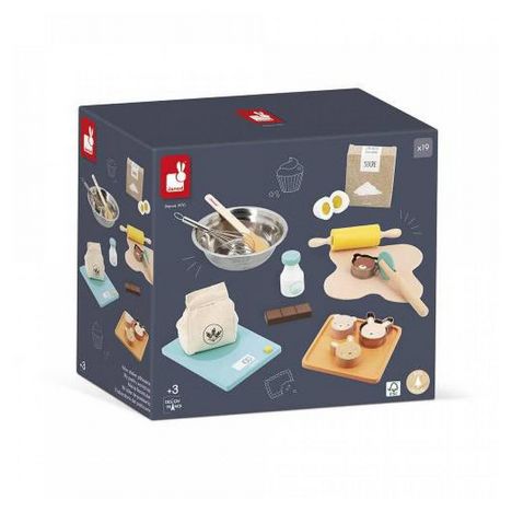Un ensemble pour jouer les apprentis pâtissiers et imiter les grands. Un atelier pour petits et grands gourmands au bois garanti FSC et à la peinture à l'eau et qui comprend plusieurs accessoires : une boîte, un sachet, une bouteille, un oeuf, un bol, un fouet, une spatule, etc.