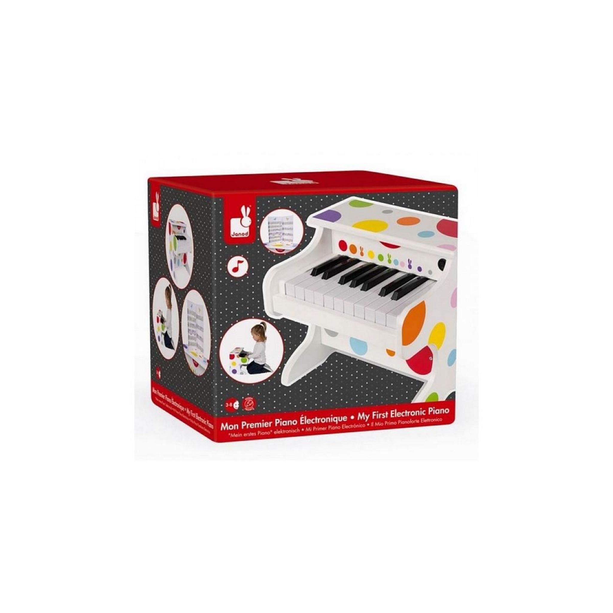 Découvrez le piano électronique 18 touches de Janod, un instrument de musique pour les enfants dès 3 ans qui décorera sa chambre et l'éveillera au son et à la musique. Approuvé par les mélomanes, il participera à l'éveil musical de votre enfant. Un instrument de musique de la gamme Confetti pour les