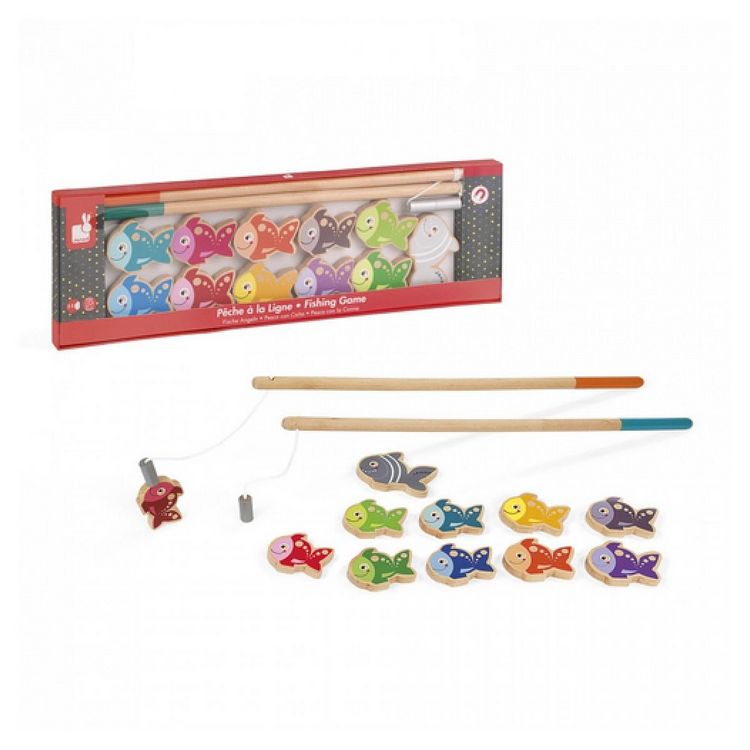 Avec ta canne à pêche, sois le premier à ramasser le plus de poissons ! Chaque poisson rapporte un certain nombre de points. Essaie d'attraper le requin en premier, il vaut déjà 10 points ! Matériau(x) utilisé(s) : bois (merisier pour les poissons et cannes).