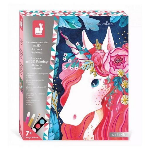 Les licornes ne demandent qu'à briller ! Ce kit créatif permet aux enfants dès 7 ans de décorer 4 tableaux à l'aide de peintures nacrées et 3D, une activité manuelle idéale pour stimuler créativité et motricité. Les licornes sont synonymes de brillance, de rêve et de mystère : elles ont besoin des enfants pour retrouver tout leur éclat ! Ce coffret contient tout le nécessaire pour exprimer sa créativité : 4 tableaux à peindre, 2 tubes de peinture 3D (couleur rose et doré), 1 palette de peinture nacrée (3 couleurs) et 1 pinceau fin. Un livret d'instructions avec modèles est également inclus, pour guider les petits artistes. La peinture nacrée donne un effet satiné aux tableaux : les licornes (et les enfants) adorent ! La peinture 3D donne, quant à elle, du relief aux créations, pour un effet Waouh ! Ce loisir créatif mêle 2 types de peinture et propose ainsi 2 techniques différentes aux enfants. Il faut compter environ 1 heure pour réaliser 1 tableau, ce qui fait de cette activité peinture une occupation calme et stimulante pour les petits créatifs. Ce coffret créatif peintures nacrée et 3D sur le thème des licornes est issu de la collection Les Ateliers du Calme. Il invite à la précision et la concentration, pour un moment de calme à la maison.