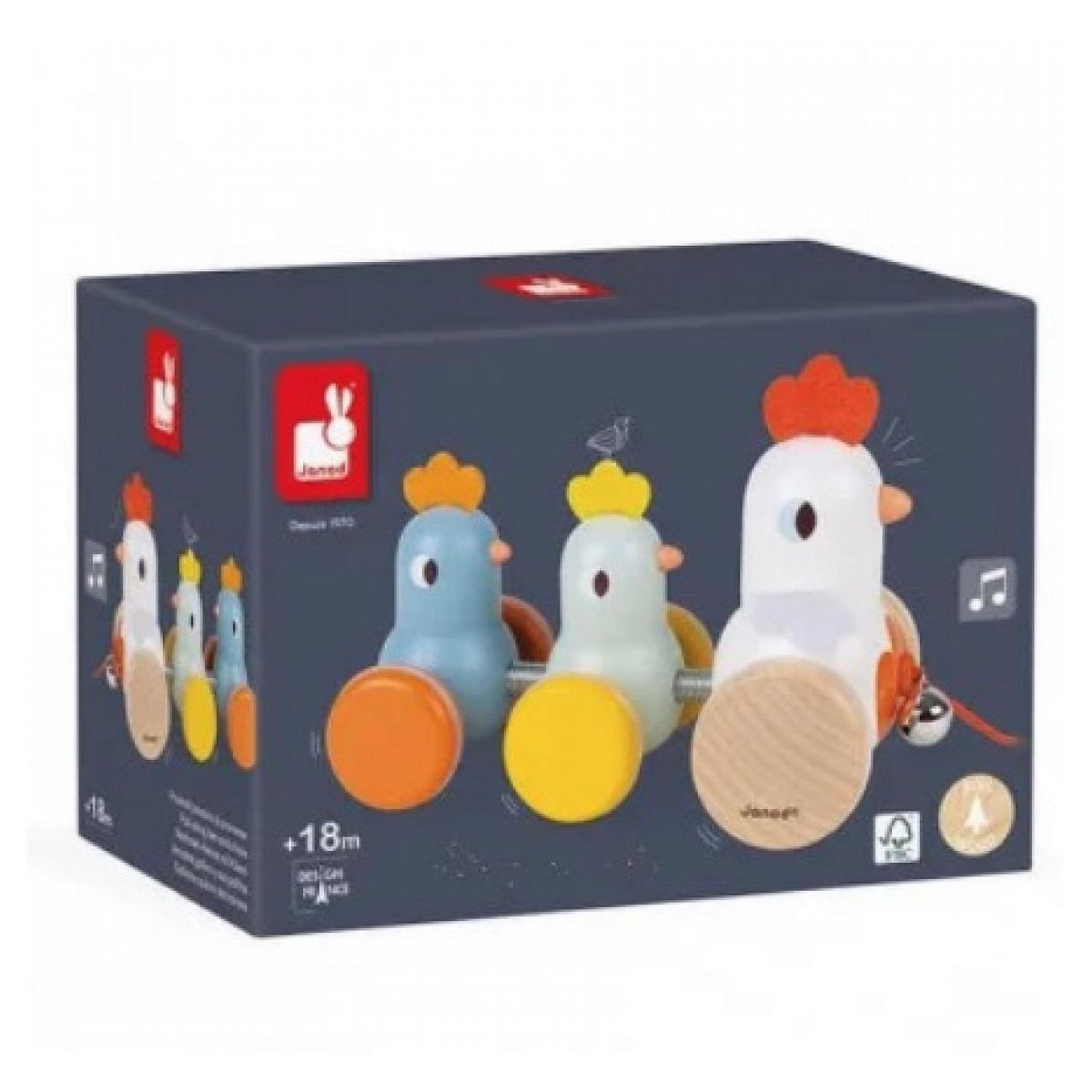 Quelle adorable famille de poule et poussins, à promener tout à loisir pour faire tinter la jolie clochette. Un jouet idéal pour motiver bébé dans ses premiers pas, un joli cadeau de 1 an à garder longtemps. En bois. Marque: Janod