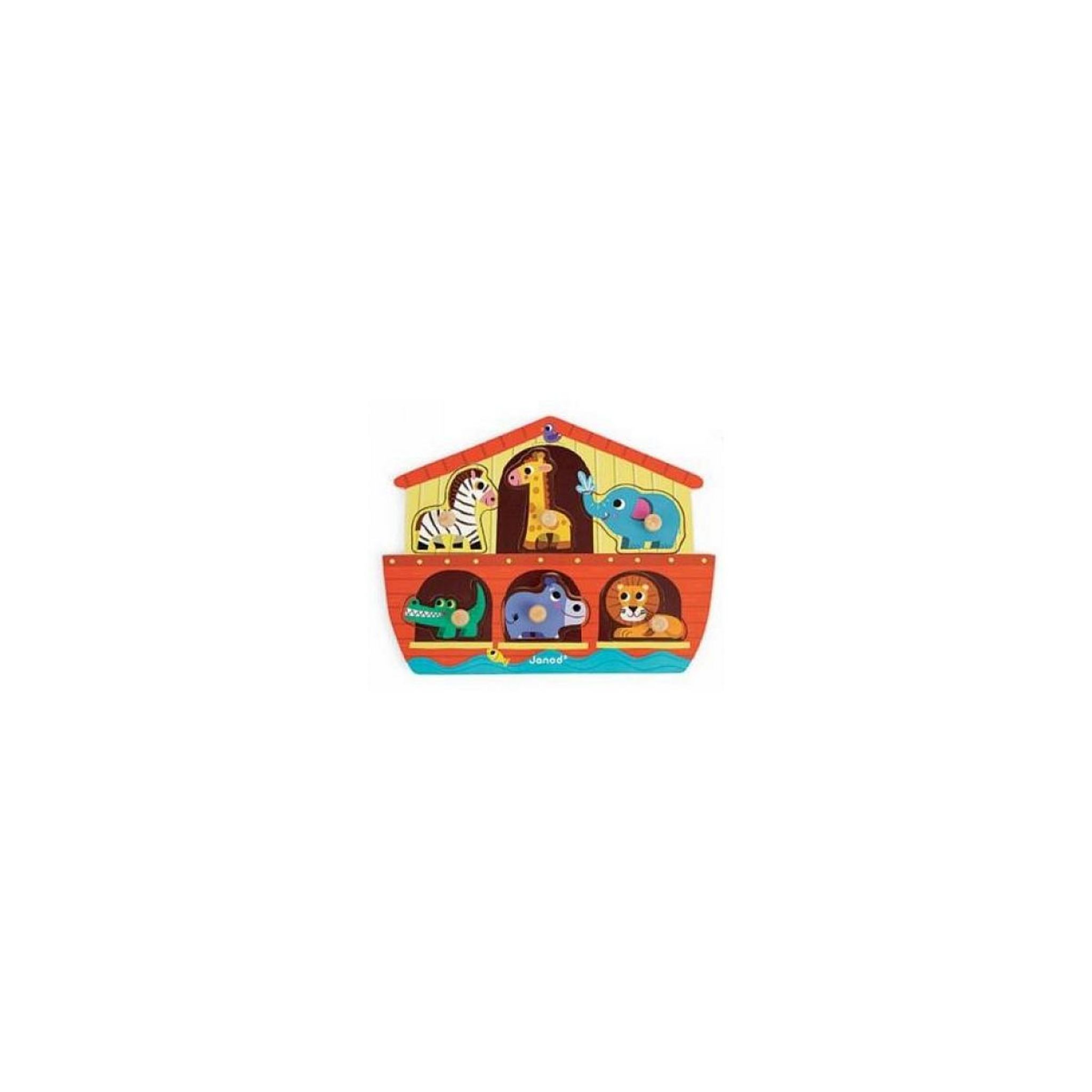 Puzzle de 6 pièces à tenons en bois. Sauve les animaux en le splaçant dans le bateau de Noé. Chaque pièce représente un animal : éléphant, girafe, zèbre, crocodile, lion, hippopotame Dimensions : 27.5 x 21.5 x 2.3 cm