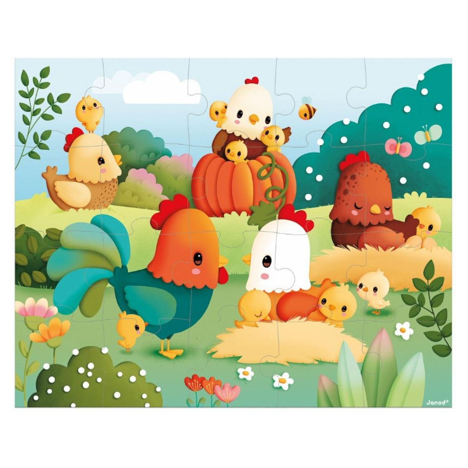 Invitez la campagne dans la chambre de votre enfant avec notre charmant Puzzle 'Bienvenue à la Basse-Cour' de 20 pièces ! Ce puzzle captivant est spécialement conçu pour les jeunes explorateurs à partir de 3 ans, offrant une expérience ludique et éducative autour des animaux de la ferme. Il développe la motricité fine, la reconnaissance des formes et des couleurs, et la patience, tout en s'amusant. Une fois assemblé, le puzzle révèle une magnifique scène animée de la basse-cour, pleine de vie et de couleurs. On y découvre des vaches, des poules, des cochons, des canards et d'autres animaux de la ferme, tous représentés avec des illustrations tendres et joyeuses qui stimulent l'imagination
