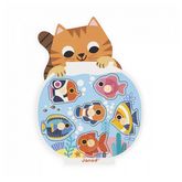 Il est composé de 6 pièces représentant des poissons différents. Le puzzle montre un chat tenant un aquarium contenant 6 poissons multicolores.