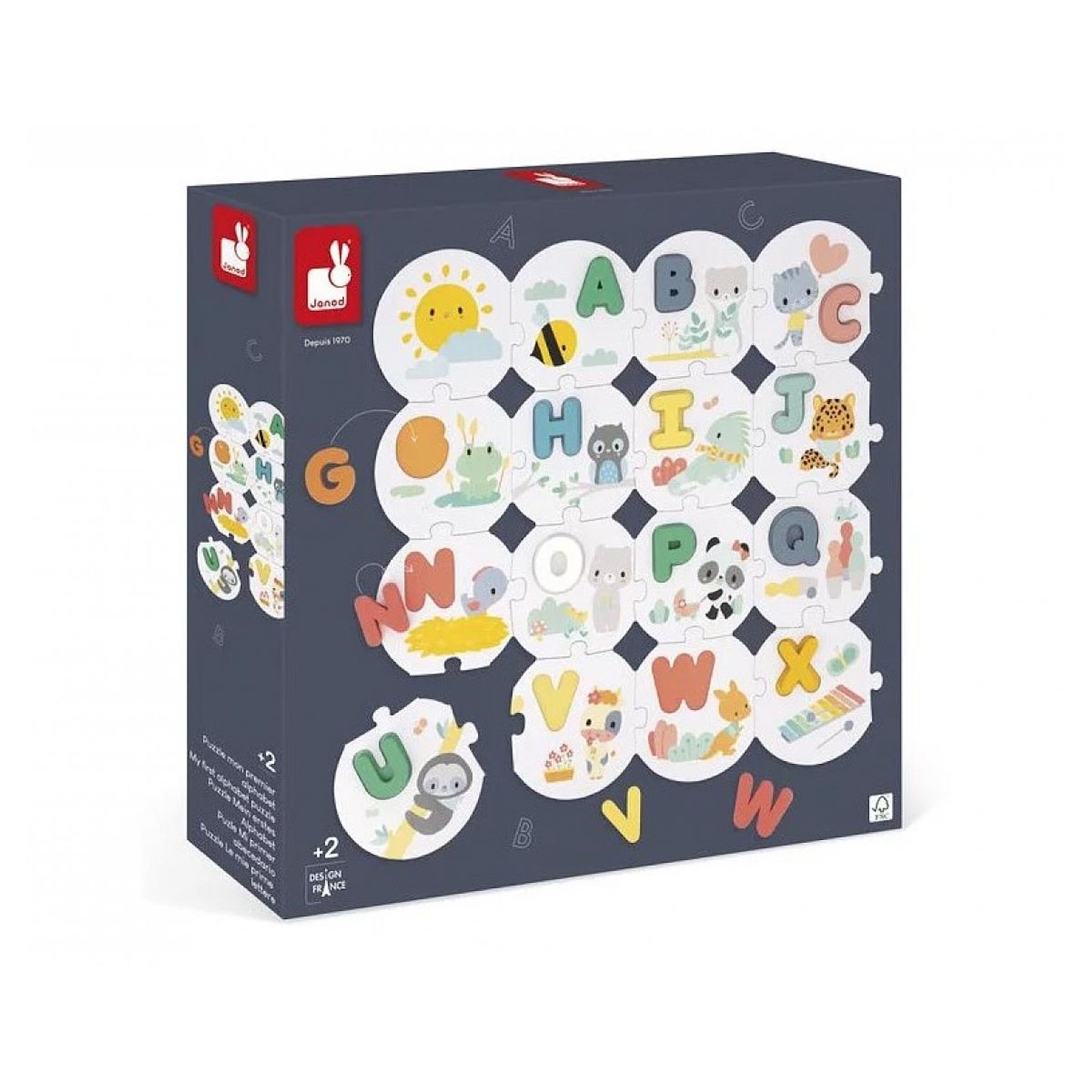 Puzzle éducatif Mon premier alphabet de la collection Pure. Contient 28 pièces en carton et 26 lettres en bois.