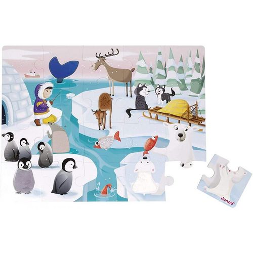 Découvrez le puzzle tactile la vie sur la banquise de Janod, un puzzle géant de 20 pièces en carton rigide avec 7 pièces tactiles pour éveiller les sens des enfants de 3 à 6 ans sur fond de banquise. Des illustrations douces et des pièces texturées, voici le mélange parfait pour gâter les enfants. I