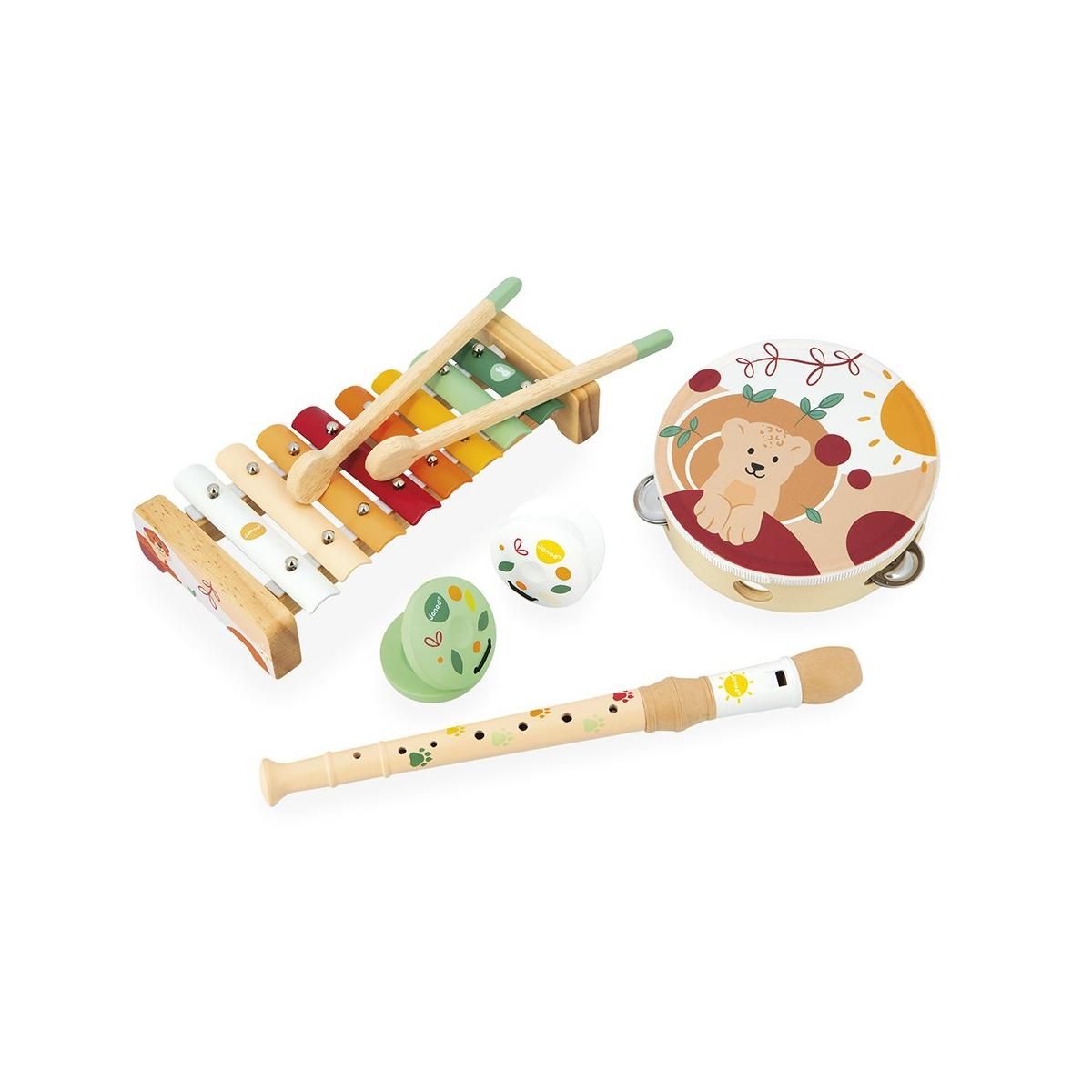 Musique maestro ! Accompagnez Léo le lionceau dans ses aventures au c?ur de la savane africaine avec ce joli set musical coloré. Ce set se compose d'un xylophone avec 8 tonalités, d'un tambourin, d'une flûte et de deux castagnettes. Votre enfant disposera d'un équipement complet pour découvrir les s