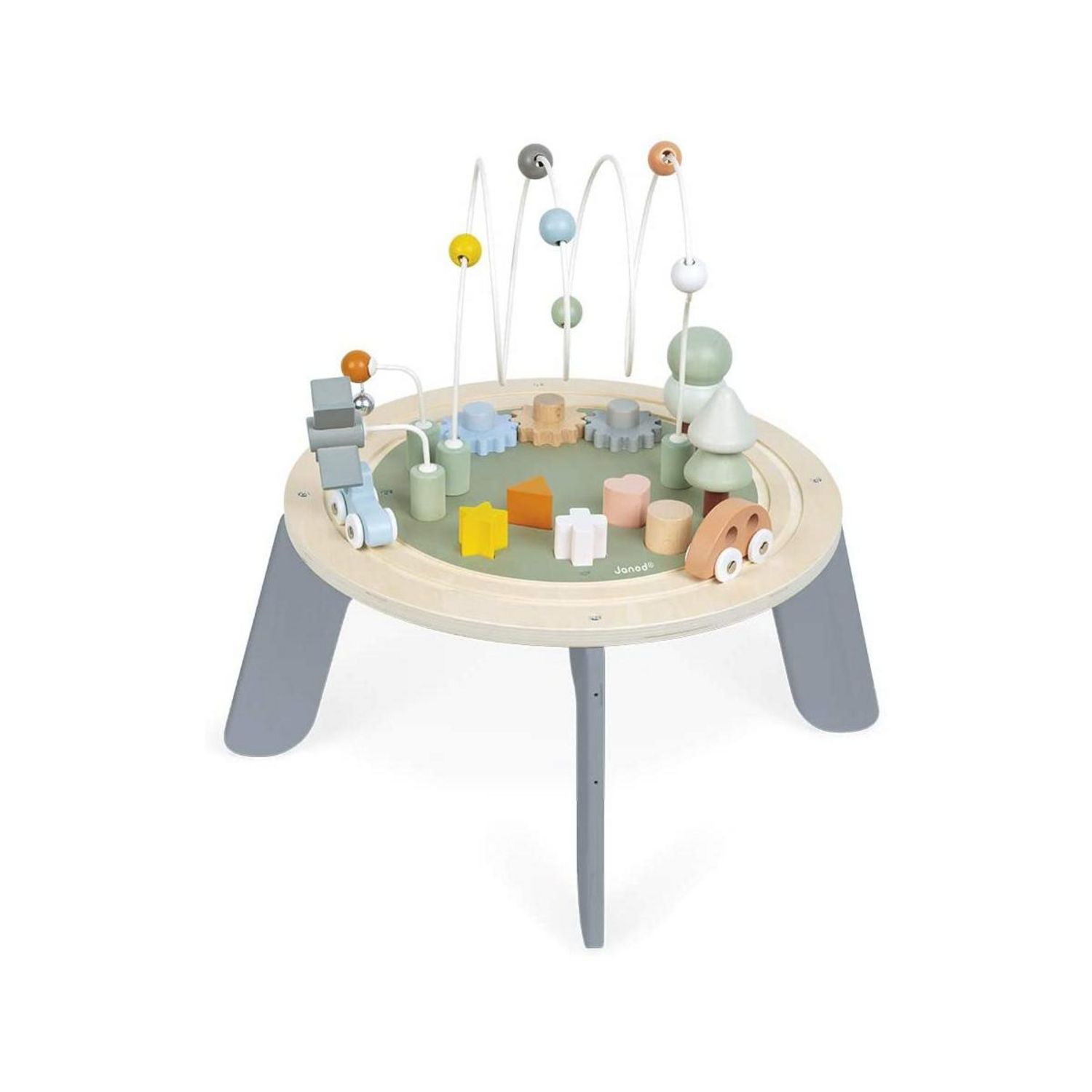En savoir +Cette table d'activités permettra à votre enfant de s'amuser tout en développant sa motricité fine. Faites en bois, avec ses couleurs pastels douces, elle invite l'enfant à développer son imaginaire et à inventer des histoires grâce par exemple au rail circulaire et à ses 3 véhicules, ou aux deux arbres à empiler. On retrouve aussi un grand looping à billes ainsi qu'un moulin et une clochette, 3 engrenages à faire tourner et des formes à encastrer. Cette table est donc parfaitement complète pour différents jeux et découvertes Les pieds peuvent être montés de 2 manières, permettant de régler la table à hauteurs différentes (14 cm ou 22,5 cm). Dimensions : 43 x 43,9 x 39,4 cm.
