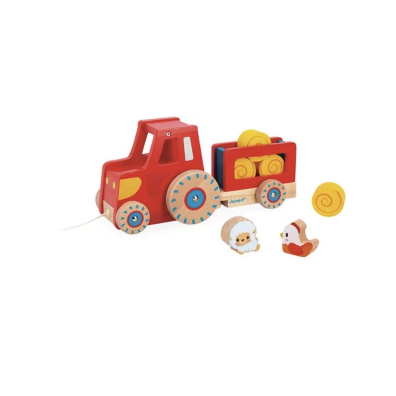 Vroum Vroum, attention c'est le tracteur qui passe ! Il est bien chargé avec toutes ses bottes de paille ! Mais où va-t-il ? Il est en route pour le champ, il doit aller nourrir les moutons et les poules qui attendent patiemment ! Ce joli tracteur en bois, se compose d'une remorque amovible, de 4 bottes de foin, d'une poule et d'un mouton. Grâce à sa ficelle pour le tirer, ce tracteur fera un super compagnon dans l'apprentissage de la marche de votre enfant. Petit plus, ses roues en silicone permettent de le déplacer silencieusement dans la maison et sans laisser de traces. Jouet en bois FSCTM. Jouet d'éveil à tirer pour les enfants à partir de 12 mois.