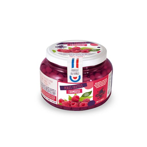 Ingrédients : Eau, sirop de Framboise 22 % (sucre, eau, jus de framboise à base de concentré 2,2%, jus de citron à base de concentré, arôme naturel, colorant : lutéine), fructose, amidon, agents gélifiants: lactate de calcium, chlorure de calcium, alginate de sodium, arôme naturel de framboise, correcteur d'acidité: acide citrique ; colorant : anthocyanes; épaississants : gomme xanthane, gomme gellane; conservateur : sorbate de potassium.