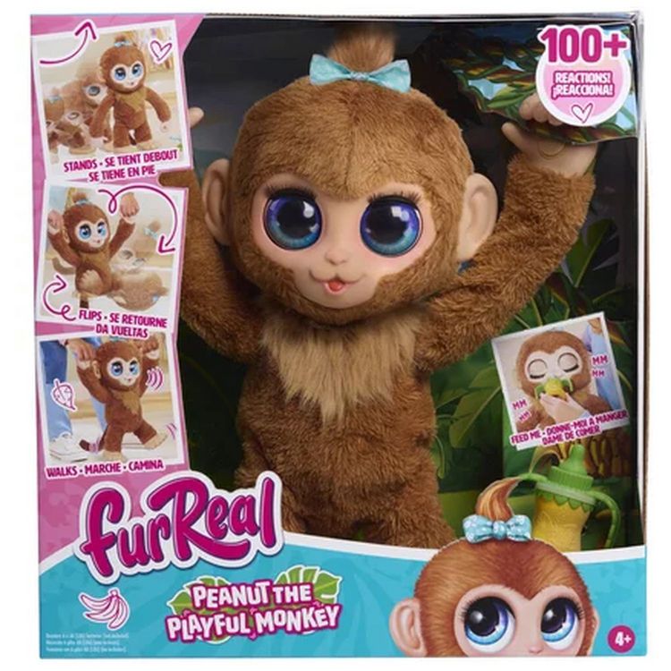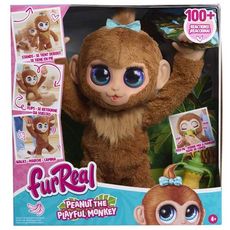 Peanut le Singe interactif de furReal avec plus de 100 sons et réactions differents. Aide-le à marcher, il se met debout tout seul. Livré avec son biberon.
