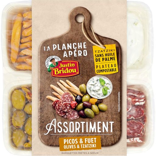 Assortiment de 4 composants : spécialité à base de yaourt et concombre, mélange d'olives vertes et noires assaisonnées, spécialité de salaison sèche espagnoles, biscuits salés Justin Bridou a réuni dans un plateau prêt-à-servir le meilleur de l'apéritif. Tout est prêt pour profiter d'un moment de convivialité.