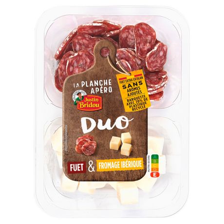 Ingrédients : FROMAGE espagnol à pâte pressée non cuite: LAITS pasteurisés de vache (max. 50%), de brebis (min. 15%) et de chèvre (min. 15%) (origine espagne), sel, stabilisant : chlorure de calcium, présure, ferment lactique (LAIT), lysozyme de blanc d'OEUF# Spécialité de salaison sèche espagnole (fuet): viande et gras de porc(origine Espagne), maltodextrine, sel, conservateurs (E326, E252), épices, colorant (E162), ferments, boyau naturel de porc. # Présence possible de gluten, crustacés, soja, poisson, fruits à coque, céleri, moutarde, graines de sésame et mollusques. # 149 g de viande utilisés pour la préparation de 100 g de fuet.