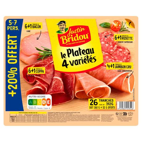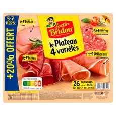 Tous les incontournables de la salaison sélectionnés par Justin Bridou : Rosette de qualité supérieure, Bacon fumé, Jambon cru Aoste finement tranché et Coppa finement poivrée. Un assortiment idéal pour vos plateaux de charcuterie et raclettes conviviales en famille et entre amis ! Format +20% Gratuit.