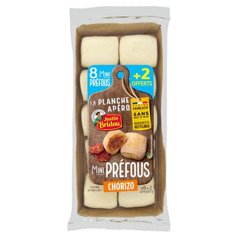 Pain pré-cuit garni d'une préparation à base de beurre, d'ail frais et de chorizo. Justin Bridou réinvente l'apéritif avec les Mini Préfous Apéro : 10 petites bouchées apéritives de bon pain moelleux et croustillant garni d’ingrédients frais et savoureux. Farine et fabrication française garanties. A dorer 10 minutes au four à 220°C dans leur barquette avant dégustation pour un apéritif gourmand et convivial. Offre : 8 portions + 2 offertes