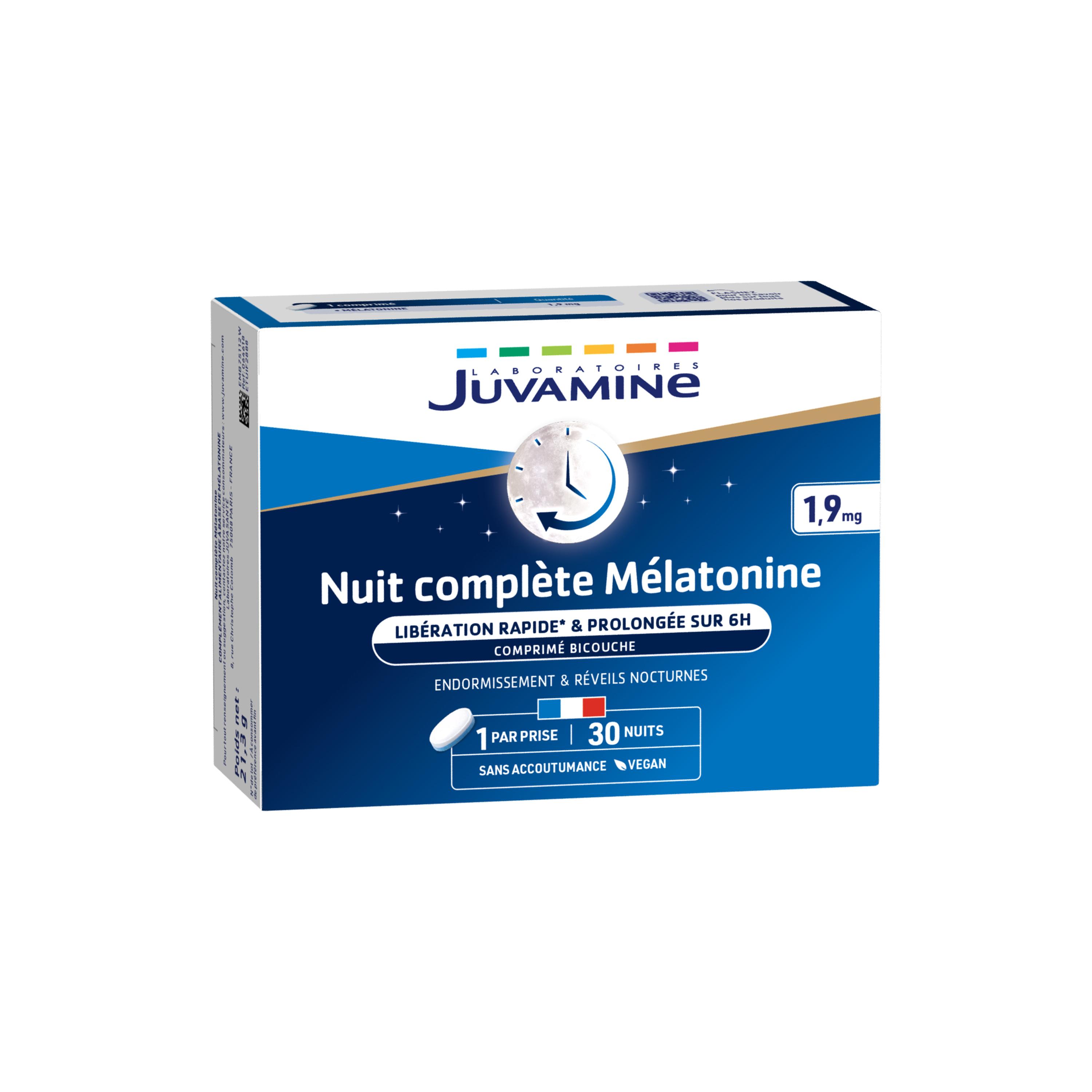 Le stress, l'exposition prolongée aux écrans, ainsi que de nombreux facteurs, peuvent perturber le sommeil et affecter le bien-être général. C’est pourquoi, avec Nuit complète Mélatonine, les Laboratoires Juvamine ont fait une formule à base de mélatonine, en comprimé bicouche : une couche à libération plus rapide* fa