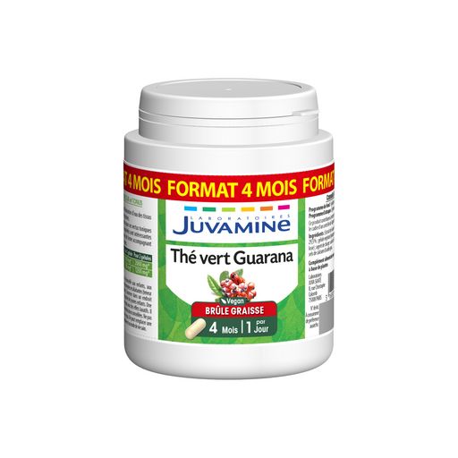 Ingrédients : Extrait de Guarana : 40% ; extrait de Thé vert : 29,5% ; gélule végétale (hydroxypropylméthylcellulose) ; agent de charge : sorbitol ; antiagglomérant : sels d’acides gras de calcium.