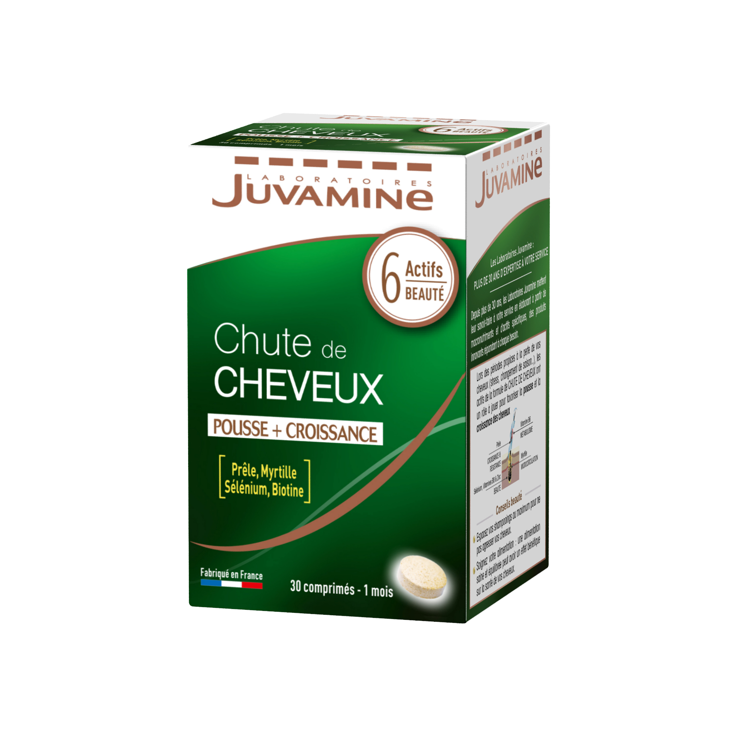 Les Laboratoires Juvamine ont élaboré le programme CHUTE DE CHEVEUX, une formule à base de 6 actifs beauté, ayant chacun un rôle à jouer pour favoriser la beauté des cheveux :