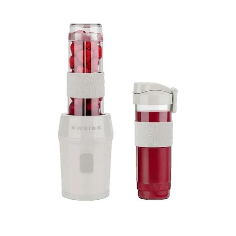 Le blender portable pratique de la marque sweiss est un appareil élégant de couleur beige, idéal pour préparer des smoothies et des boissons vitaminées quelle que soit la location. Avec une capacité de 570 ml, il est accompagné de deux bouteilles équipées de bouchons de voyage et de poignées en sili