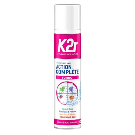 Détachant Avant Lavage K2r Aérosol, formule action complète turbo La solution la plus optimale pour détacher efficacement tous les types de taches même incrustées Efficace sur les taches herbe & boue, maquillage & peinture, nourriture & boisson, transpiration & sang. Issue de la recherche et de l'expertise K2r, sa formule est une combinaison d'agents spécifiques pour éliminer tous les types de taches.