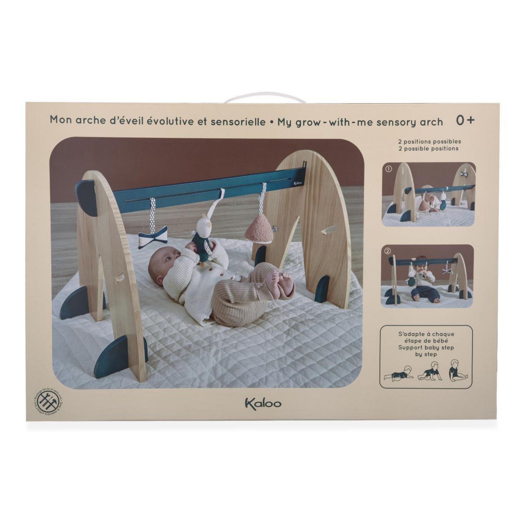 Arche d'activités evolutive en bois : plusieurs hauteur pour installer les jouets . 3 accessoires sensoriels founies