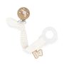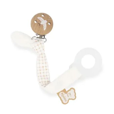Découvrez notre jolie attache-tétine de 22 cm en tissu bi-matière. D'un côté un tissu crème éponge pour absorber les bavures de bébé et de l'autre un imprimé vichy, offrira une découverte des différentes matières pour bébé. Une élégante hirondelle est sérigraphiée sur son accroche en bois. Le système d'attache est compatible pour les tétines sans anneau grâce à son embout en silicone. Lavable en surface uniquement. Dès la naissance.