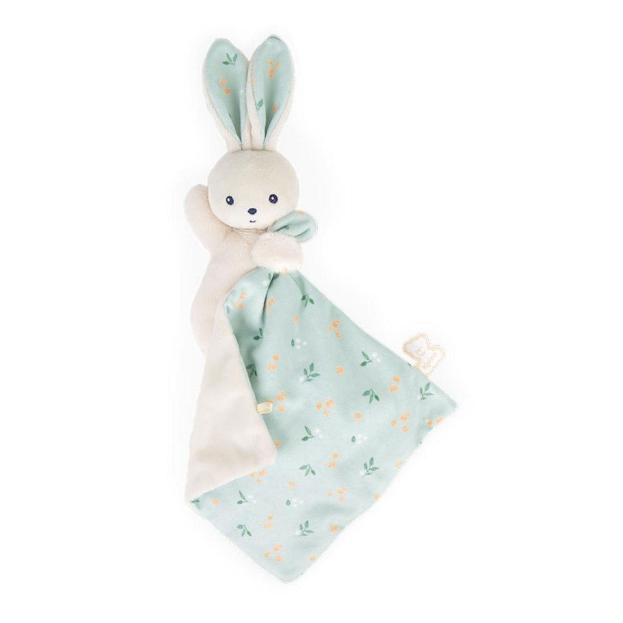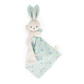 Ce doudou lapin enveloppé dans son carré de douceur sera le compagnon préféré de bébé. Avec son petit corps moelleux en micro-velours, le lapin est facile à aggriper et à tenir par le corps ou ses longues oreilles. Le doudou plat vert d'eau carré entre ses mains est habillé de citrons qui partagent