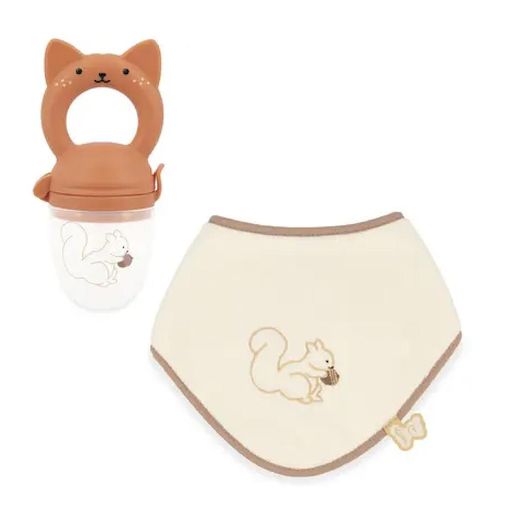 Ce coffret bavoir et grignoteuse est pensé et concu pour accompagner bébé dans ses premières découvertes gustatives. Le coffret est composé d'une grignoteuse, permettant d'y introduire des morceaux de fruits ou de légumes afin de développer la diversification alimentaire de bébé. La grignoteuse écureuil, éveille en douceur l'envie de mâcher de bébé et l'aide à explorer les saveurs à son rythme en toute sécurité. La forme ergonomique et ludique stimule la motricité tout en soulageant les gencives lors des poussées dentaires. Un bavoir en coton accompagne ce coffret avec une jolie broderie écureuil qui protège ainsi bébé avec douceur. Bavoir : Lavable en machine à 30°C, Grignoteuse : Lavage en surface uniquement. Dès 6 mois.