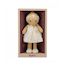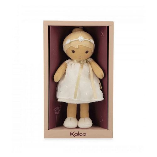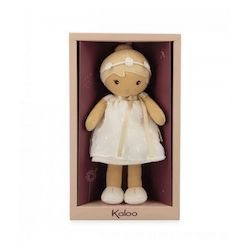 C'est le moment de rencontrer Daphné : une jolie poupée en tissu pleine d'élégance, dans son format 25 cm ! Adaptée à bébé dès sa naissance, elle fait partie de la collection de poupées Tendresse de Kaloo. Élégamment vêtue d'une robe ivoire à pois en organza, la poupée Daphné est prête à célébrer les moments les plus précieux comme un baptême ou un mariage. Son chignon joliment relevé apporte une touche distinguée et ses souliers assortis viennent parfaire son allure raffinée et élégante. Daphné est une poupée qui reflète la pureté et la douceur des instants précieux. Sa tenue aérienne est sublimée par une délicate couronne de fleurs, telle une touche finale de poésie. Avec son regard paisible et son allure délicate, Daphné invite à la douceur et à la rêverie. Elle semble tout droit sortie d'un moment suspendu, où le silence apaise et les gestes tendres réconfortent. Elle incarne ces instants calmes où l'on prend le temps de ressentir, comme une brise légère qui effleure la peau. D'une grande douceur, elle se laisse volontiers saisir par les petites mains et devient vite la complice idéale de tendre câlins. Discrète et pleine de charme, Daphné s'invite naturellement dans le quotidien des tout-petits. Dans son dos, un petit ruban cousu permet d'inscrire le prénom de bébé, pour en faire une amie unique et précieuse. Présentée dans une jolie boîte, elle est un cadeau de naissance original, empreint de douceur et de poésie. Elle est aussi parfaite comme première poupée pour stimuler l'imagination des petits. Confectionnée avec soin, cette poupée en tissu est composée avec au moins 80% de matières recyclées, y compris son rembourrage en polyester recyclé. Lavable en machine à 30°, cette adorable poupée est prête à être adoptée et aimée pour longtemps !