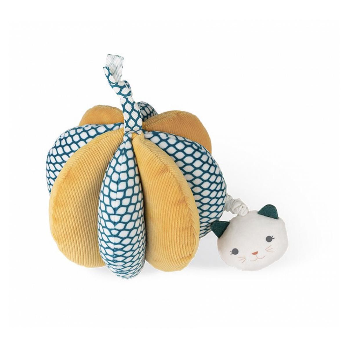 La balle pensée rien que pour bébé ! Cette balle de préhension vibrante en tissu est idéale pour éveiller bébé et stimuler ses sens, dès la naissance. Moelleuse, toute douce et avec un joli petit chat : offrez à votre tout-petit un jouet d'éveil qui l'aidera à développer ses sens ! On accroche la balle à l'arche d'éveil de bébé grâce à son ruban, et on laisse l'enfant découvrir de nouvelles sensations à son rythme. Lorsque bébé tire sur la tête du chat, la balle se met à vibrer ! Ce module vibrant est idéal pour introduire le principe de cause à effet à l'enfant et attisera sa curiosité. Jouet d'éveil sensoriel complet, ce petit ballon aidera votre enfant à développer son sens du toucher grâce à des textures différentes et sa préhension fine lorsqu'il saisit le chat et le tire vers lui, parfait pour développer sa coordination. Pour stimuler la vue de bébé, les imprimés contrastés de cette balle en tissu ont été pensés pour s'adapter à la perception des contrastes de l'enfant. Cette balle de préhension fait partie de la gamme Stimuli de KALOO, développée en collaboration avec des psychomotriciens pour aider bébé à développer ses compétences sensori-motrices dès la naissance.