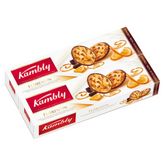Chocolat 30% (pâte de cacao, sucre, beurre de cacao, BEURRE concentré, émulsifiant [lécithines de SOJA], arôme naturel de vanille), sucre, amandes 17%, pépites aux fruits 6% (humectant [glycérol], purée concentré de pommes, sirop de fructose-glucose, sirop de glucose, jus concentré d'orange 0.4%, fibres de BLE, sucre, amidon de riz, graisse de palme, gélifiant [pectines], correcteur d'acidité [acide citrique], concentré de légumes [carotte, potiron], arôme naturel d'orange, antioxydant [acide ascorbique]), fécule de pomme de terre, farine de BLE, graisse de palme, sirop de glucose, BEURRE, blanc d'OEUF en poudre, amidon de BLE, huile de tournesol, émulsifiant (lécithines de SOJA), LAIT entier en poudre, miel de pâtisserie, LAIT écrémé en poudre, sel, huile essentielle d'orange. Peut contenir des traces d’autres FRUITS À COQUE.