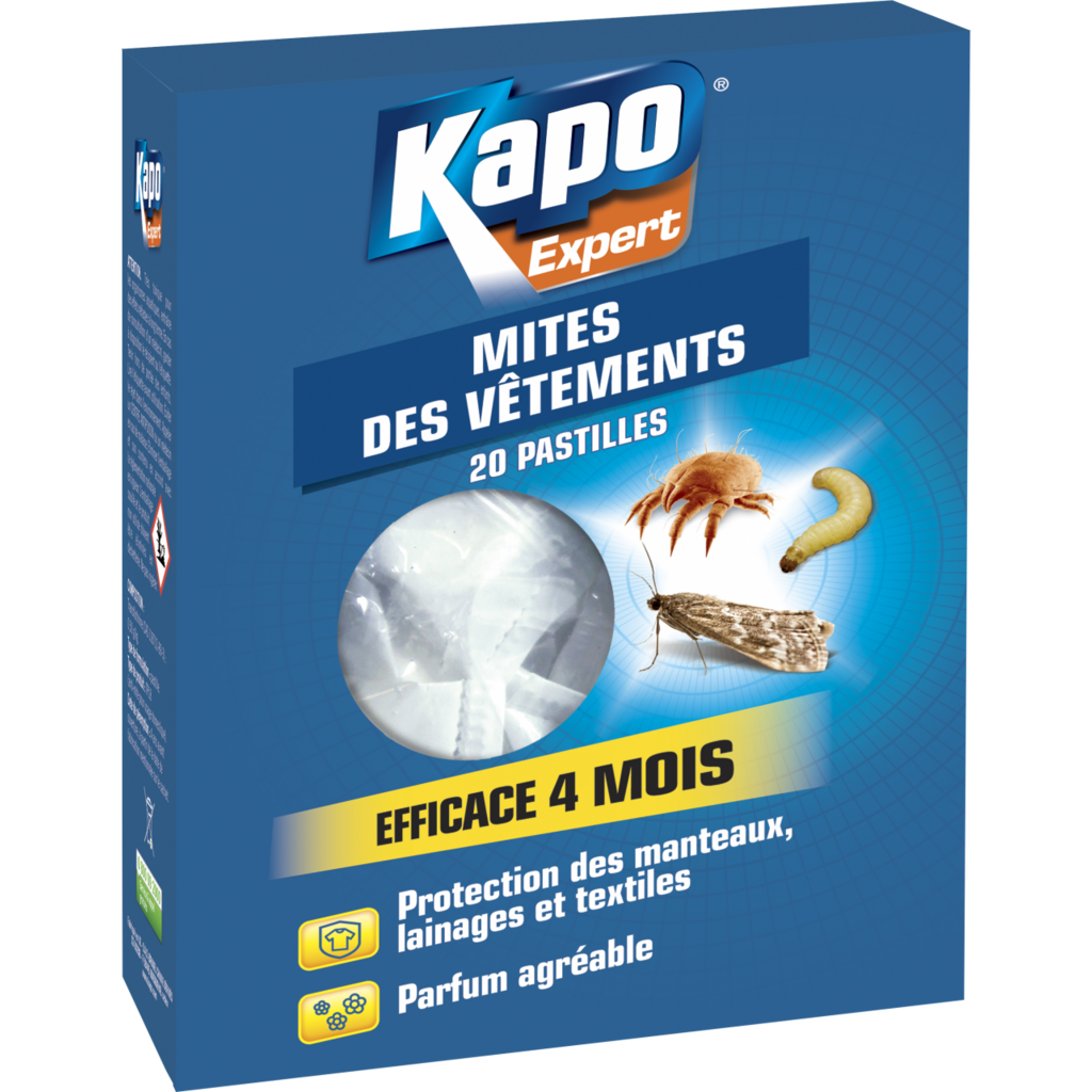 Elles ne tachent pas. Emballées en sachet individuel.Les pastilles anti-mites, larves et acariens Kapo protègent efficacement vos manteaux, lainages et textiles pendant toute une saison tout en diffusant un léger parfum.Nom du produit: InsecticideCible (animaux, parasites, maladies...): Mites et lar