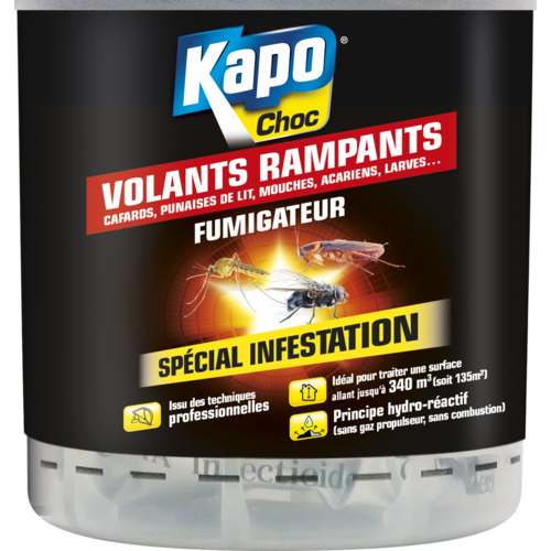 Le Fumigateur Tous Insectes Kapo détient une action radicale et longue durée sur tous types d'insectes : insectes rampants, volants, larves et acariens. Il est également efficace sur les cafards, blattes, puces, punaises, guêpes, mouches, mites. Lors de son utilisation, il ne tache pas et ne laisse aucun dépôt. Il s'utilise dans la maison ou en appartement pour traiter les locaux infestés, y compris les moquettes, tentures, tapis, vêtements, matelas.Peut être aussi utilisé dans des bureaux, sans risque pour le matériel électrique ou informatique.