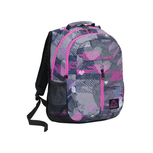 Sac à dos kappa fille, 2 compartiments zippés, 1 poche avant zippéé, 2 petites poches en filet sur les cotés, 1 poignée, brettelles matelassées. Tissu polyester 6D pailleté, coloris pop love