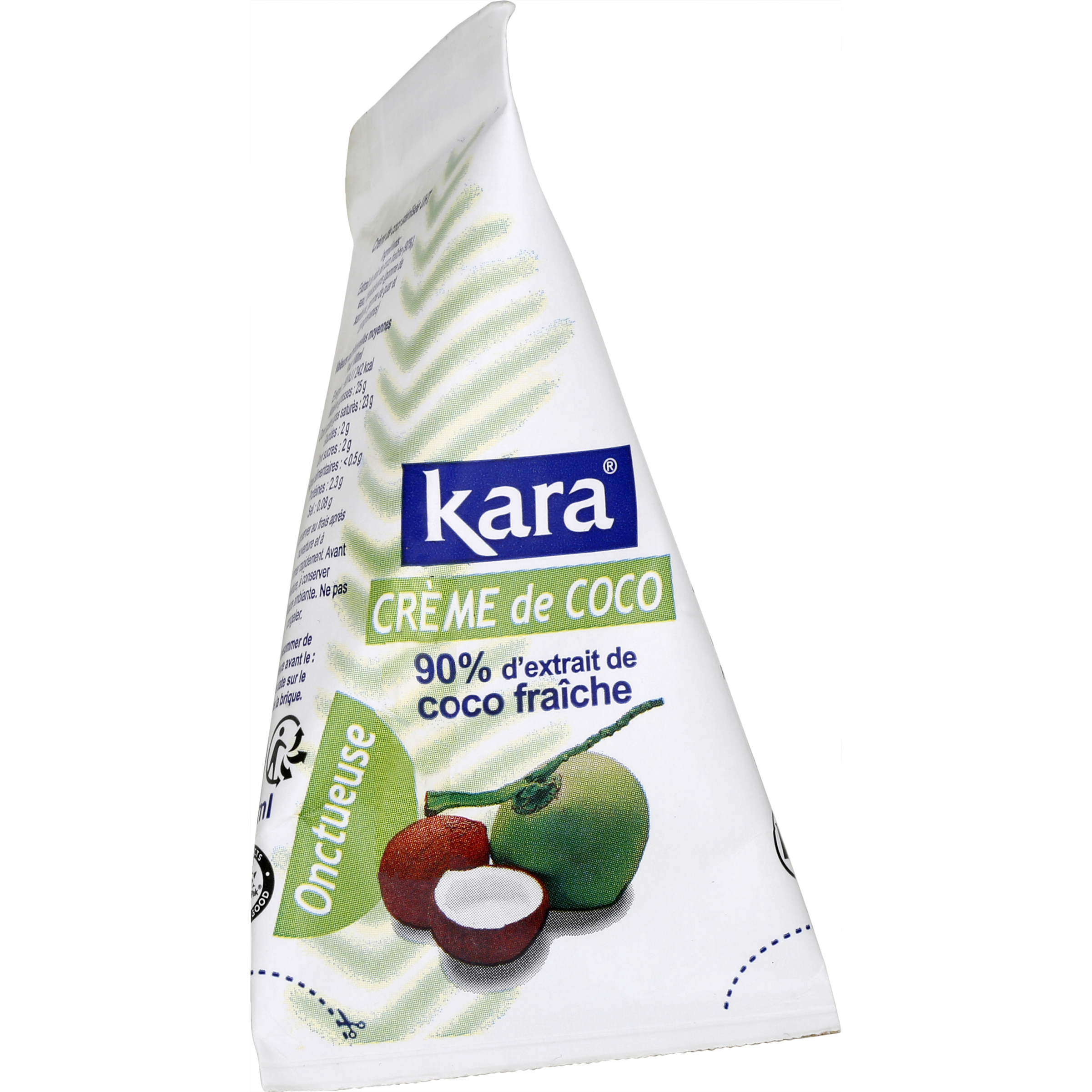 Crème de coco stérilisée UHT La crème de coco Kara est un véritable concentré de noix de coco, idéale pour réaliser des plats onctueux, sucrés ou salés. Dans ce format berlingot, elle vous permet de doser plus facilement pour la réalisation de plat unique ou de dessert.