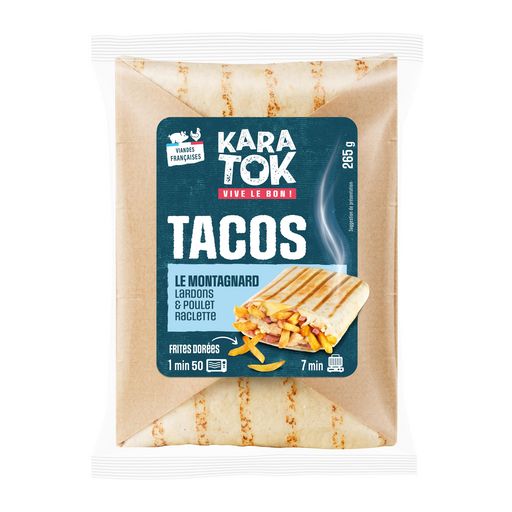 Au four à micro-ondes : Retirer le film plastique et réchauffer le tacos dans son emballage carton au four à microondes pendant 1 minute 50s à 750W. Laisser reposer 1 minute et déguster