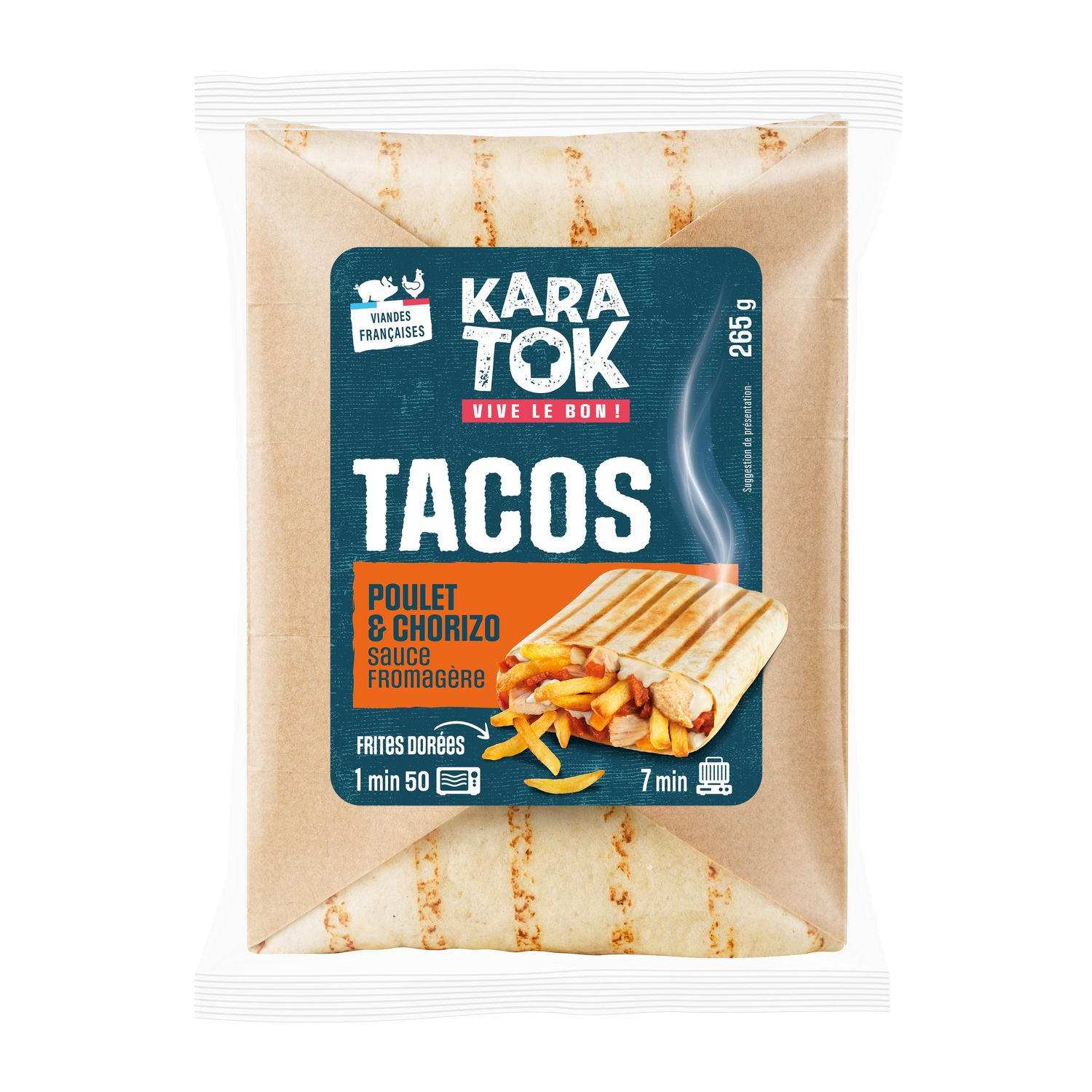 Au four à micro-ondes : Retirer le film plastique et réchauffer le tacos dans son emballage carton au four à microondes pendant 1 minute 50s à 750W. Laisser reposer 1 minute et déguster