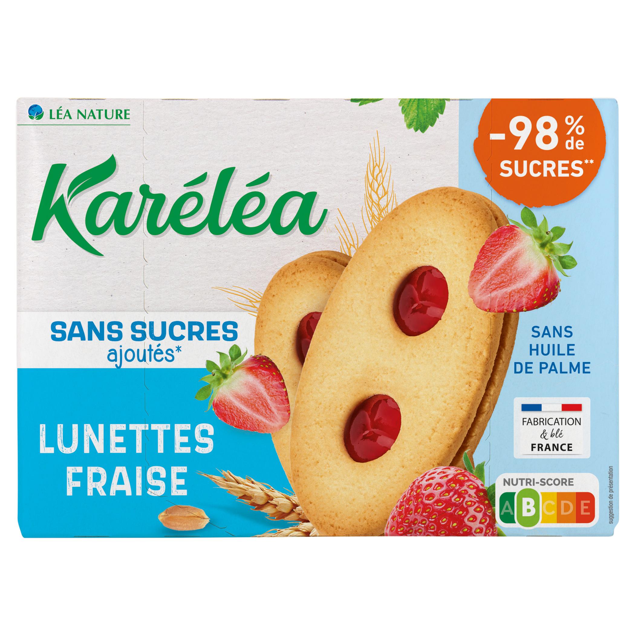 Succombez à la gourmandise avec ces lunettes à la fraise Karéléa ! Avec son biscuit délicatement beurré, associé au fondant d"un fourrage à la fraise, tout ceci avec 98% de sucres en moins que les produits de même catégories. Les lunettes fraises sans sucres ajoutés Karéléa sont LA recette idéale pour sublimer toutes vos pauses fruitées sans culpabiliser. Un vrai moment de plaisir ! Sans huile de palme Nutriscore B Fabriqué en Charente-Maritime dans notre biscuiterie Farine française moulue à moins de 100km de la biscuiterie Etui + sachet recyclables Sans sucres ajoutés Source de fibres 3 sachets de 2 biscuits