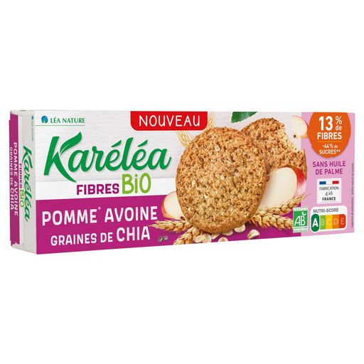Karelea Bio innove avec ce biscuit bio réduit en sucres, naturellement riche en fibres (fibres de pomme, avoine, acacia, graines de chia, blé complet) et gourmand avec des notes de pomme cuite, douceur de l'avoine, croustillance des graines de chia. Sans huile de palme Fabriqué en Charente Maritime dans notre biscuiterie Farine française moulue à moins de 100km de la biscuiterie Etui + sachet recyclable 1% For the planet -44% de sucres 13% de fibres bio 3 sachets de 3 biscuits