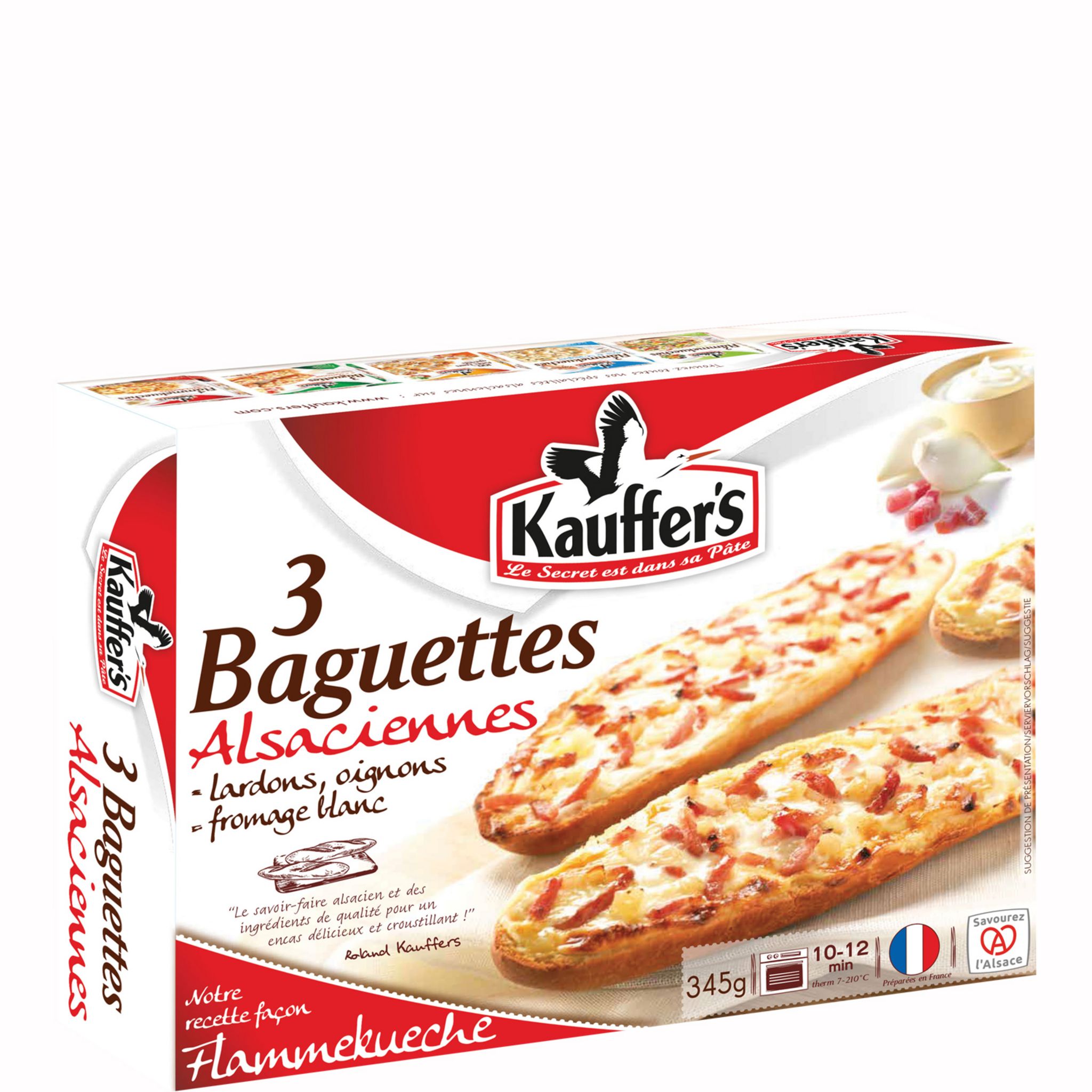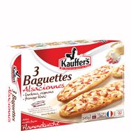 Prêtes en quelques minutes, et pratiques à manger sans couverts, les baguettes Kauffer’s sont aussi très gourmandes grâce à leur garniture généreuse. Garnies de crème, lardons et oignons, les baguettes sont une variante snacking gourmande et originale du produit phare du terroir alsacien : la flammekueche