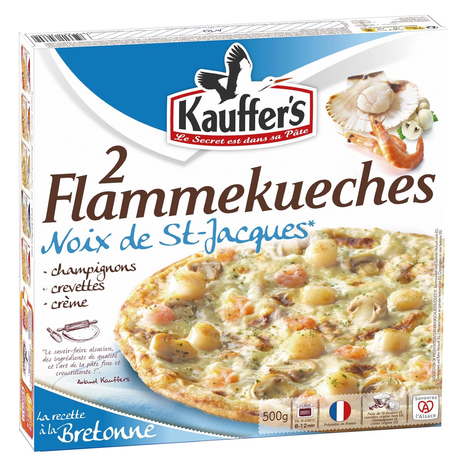 Noix de saint Jacques minuscules, crevettes quasi inexistantes, goût crème principalement avec quelques champignon. Déception à l’ouverture de la flamekueche qui n’a rien à voir avec la photo de l’emballage. Je ne recommande pas ce produit.