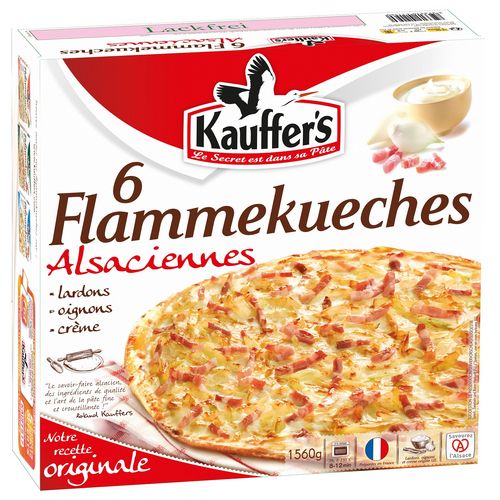 Farine de BLÉ, eau, FROMAGE blanc 14%, CRÈME 14 %, lardons fumés 11% (poitrine de porc (origine : *), sel, dextrose, épices, arôme de fumée, arômes naturels, conservateur : E250, antioxydant : E301), oignon 9%, huile de colza, LAIT entier en poudre, amidons modifiés, sel, gélatine porcine, farine de BLÉ malté, agent de traitement de la farine : L-cystéine, poivre. * : Porc né, élevé, abattu en UE. Transformé en France. Oignons et crème origine UE. Traces possibles de CRUSTACÉ, POISSON, MOLLUSQUE, MOUTARDE, ŒUF, CÉLERI et SULFITES.