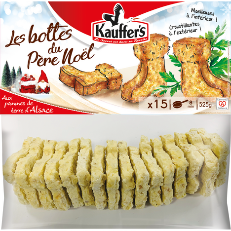Avec leur forme ludique en bottes de Père Noël, ces Grumbeerekiechle seront parfaites pour vos repas de fête ! Faire chauffer de l'huile dans une poêle. Mettre les galettes encore congelées dans l'huile bien chaude. Faire dorer la première face pendant 4 minutes environ puis retourner les galettes et faire dorer la deuxième face pour obtenir deux surfaces bien croustillantes.