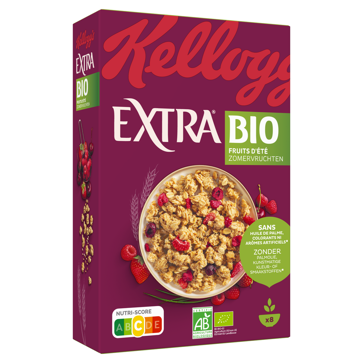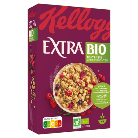 Pépites d'avoine croustillantes avec des framboises, cerises et fraises lyophilisées, issues de l'agriculture biologique. Kellogg’s présente Extra Bio Fruits d’Été. Le Bio n’a jamais été aussi bon ! Un granola au délicieux mélange de pépites croustillantes dorées au four, associées à de tendres morceaux de cerises, fraises et framboises . Soyez confiants, cette recette est : Conçue avec des ingrédients bio Sans huile de palme Sans arômes ni colorants artificiels Extra Bio est conçu en utilisant des ingrédients de la plus haute qualité . La recette est certifiée par un organisme indépendant afin d’obtenir le label AB. Découvrez aussi les autres recettes de la gamme : Extra Bio Chocolat Noir & Extra Bio Nature, toutes aussi délicieuses !