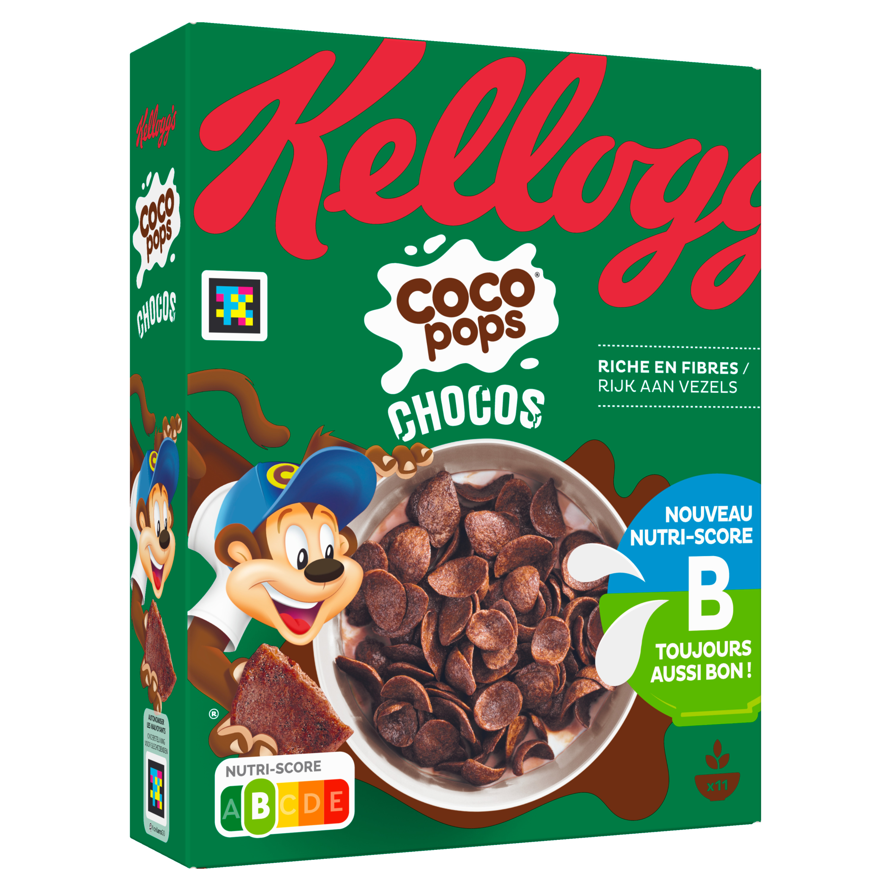 Pour bien commencer la journée, rien de tel qu'un petit déjeuner avec Coco Pops Chocos et son ami Coco, le singe malicieux ! Cocos Pops Chocos sont de délicieuses pétales de blé au bon goût de chocolat de la jungle*. Ces céréales croustillantes rendent le lait délicieusement chocolaté ! Les céréales Coco Pops Chocos ont tout pour bien commencer la journée, au sein d'un petit déjeuner équilibré avec un produit laitier et un fruit : - Une combinaison de glucides, - Riches en vitamines du groupe B et D, - Source de calcium, - Riches en fer. *Le saviez-vous ? C'est dans la jungle chaude et humide que pousse le cacaoyer. Le fruit de cet arbre, la cabosse contient des fèves que l'on peut sécher et broyer pour faire de la poudre de cacao, un ingrédient principal du chocolat.