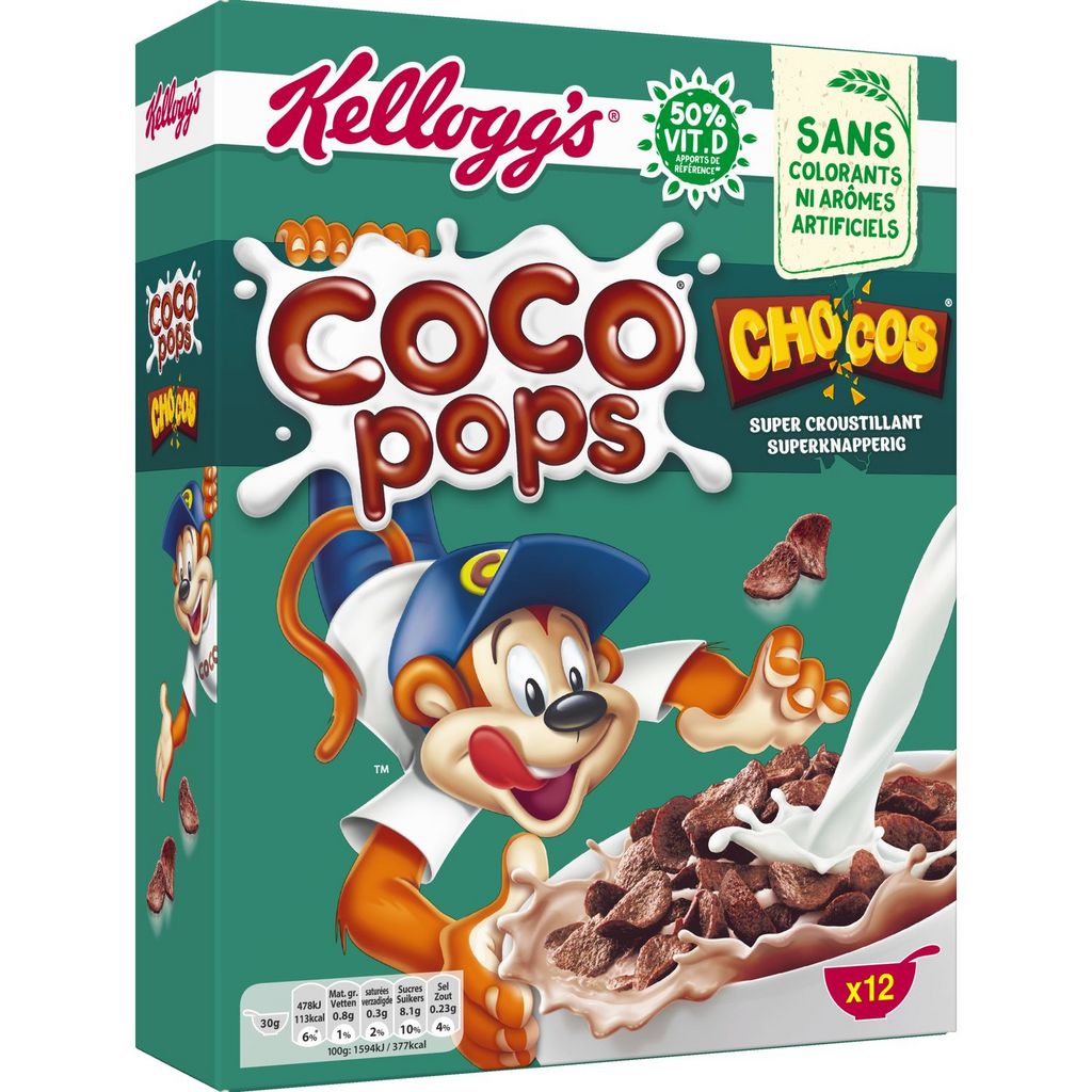 Céréales croustillantes de blé au chocolat enrichies en vitamines et en fer. Pour bien commencer la journée, rien de tel qu'un petit déjeuner avec Coco Pops Chocos et son ami Coco, le singe malicieux ! Cocos Pops Chocos sont de délicieuses pétales de blé au bon goût de chocolat de la jungle*. Ces céréales croustillantes rendent le lait déliceusement chocolaté ! Les céréales Coco Pops Chocos ont tout pour bien commencer la journée, au sein d'un petit déjeuner équilibré avec un produit laitier et un fruit : - Une combinaison de glucides, - Riches en vitamines du groupe B et D, - Source de calcium, - Riches en fer. *Le saviez-vous ? C'est dans la jungle chaude et humide que pousse le cacaoyer. Le fruit de cet arbre, la cabosse contient des fèves que l'on peut sécher et broyer pour faire de la poudre de cacao, un ingrédient principal du chocolat.